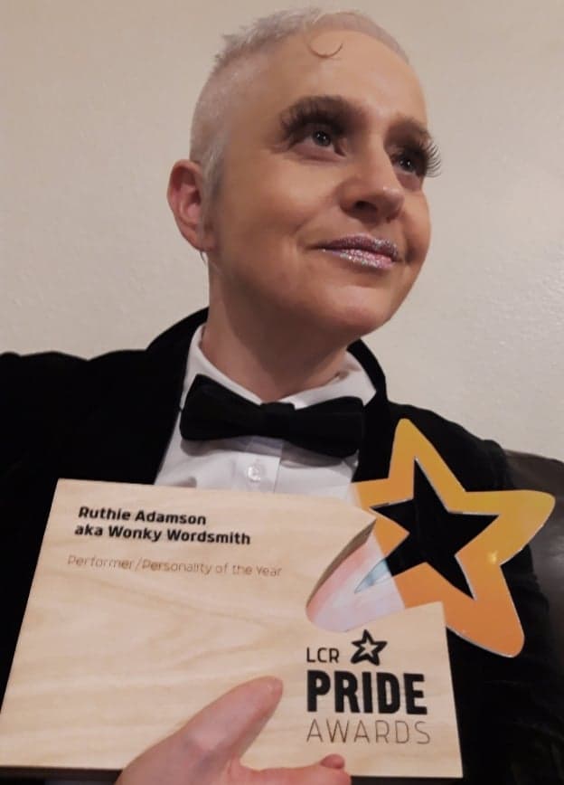 Award Winning and published performance poet Ruthie Adamson, AKA Wonky Wordsmith, is wonky because it wasn’t her fate to be straight so she is homosexual and asymmetrical and a wordsmith because she wows with words about those things and other very varied subjects. She is self-taught Liverpudlian literata. Her famous fans include singer-songwriter-playwright-poet Suzanne Vega who describes her as an eloquent natural performer, The Scaffold’s John Gorman who calls her a poetic tour de force and human rights activist Peter Tatchell who gave her post performance praise when she recently opened for him. Scotland’s equivalent of poet laureate Jackie Kay advised her to have faith in her poetic prowess and that faith has propelled her from grassroots gigs to performing for festivals. She recently performed for Chester Pride where her host described her as the Maya Angelo of the queer world. She was recently shortlisted for a performer of the year award but she says her richest reward is when those who jump aboard her rhyming roller coaster rides feel inspired. She is neither famous or infamous herself but she is working on being both so watch this space!