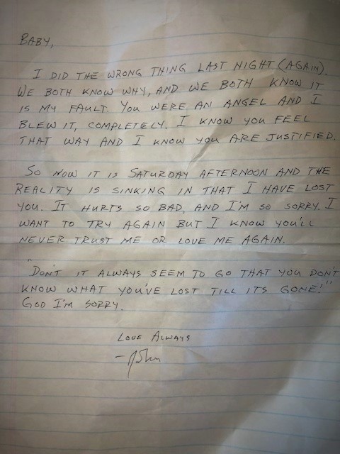 My ex-husband John could have left it in the bedroom when he came to get his things, after I broke up with him on the phone, telling him not to come back. We had purchased the house together, had slept in the same spot I was sitting in reading a letter left for me over 21 years ago. A letter I never saw.